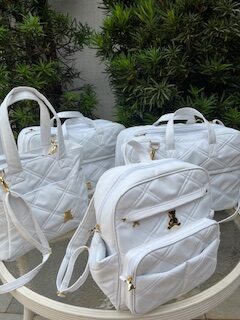 078 – Mala Maternidade: A mala com duas repartições, uma delas com um elástico em “x”, permitindo que as roupinhas sejam melhor organizadas e seguras. Vários outros bolsos e trocador. Inclui alça de transpaçar